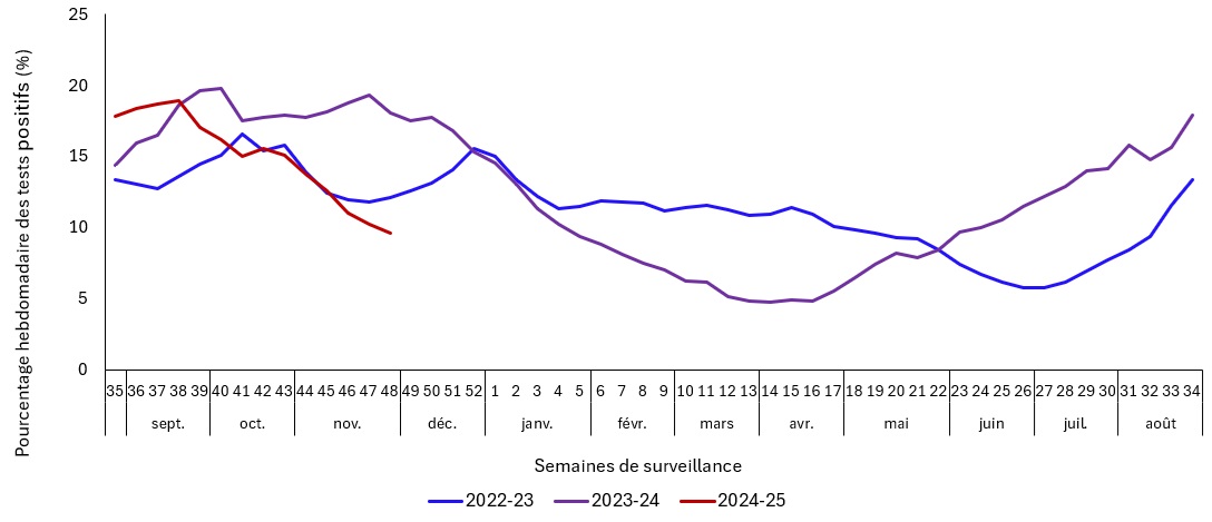 Public Health Agency of Canada. Respiratory virus detections in Canada. Ottawa (ON). Public Health Agency of Canada; 10 juil 2024 [cited 9 déc 2024]. Disponible à : https://www.canada.ca/en/public-health/services/surveillance/respiratory-virus-detections-canada.html