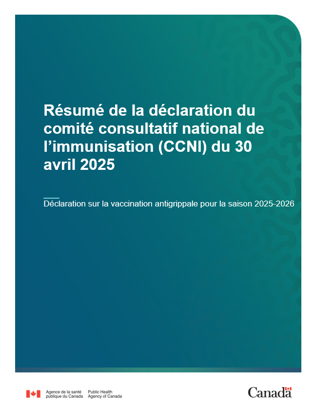 - Le 30 avril 2025, l'Agence de la santé publique du Canada (ASPC) a publié la Déclaration sur la vaccination antigrippale pour la saison 2025-2026 du Comité consultatif national de l'immunisation (CCNI). Ces directives sont fondées sur les données probantes actuelles et sur l'avis des experts du CCNI.