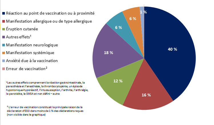 La figure 2 présente les principaux types d’ESSI (graves et non graves) déclarés de janvier à juin 2018. À l’exclusion de la catégorie « Autres effets », la plupart des ESSI déclarés étaient des réactions au point de vaccination, suivis de manifestations allergiques ou de type allergique.