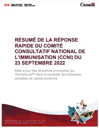 - Le 23 septembre 2022, l'Agence de la santé publique du Canada (ASPC) a publié une mise à jour des directives du Comité consultatif national de l'immunisation (CCNI) sur l'utilisation du vaccin Imvamune dans le contexte des éclosions de variole simienne en cours au Canada.