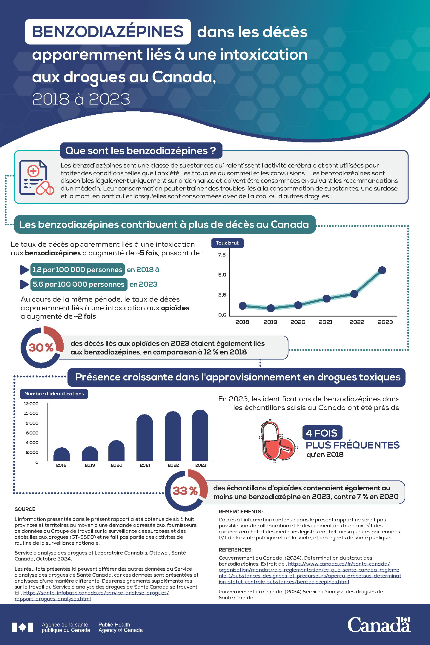 Benzodiazépines dans les décès apparemment liés à une intoxication aux drogues au Canada, 2018 à 2023 : Infographie