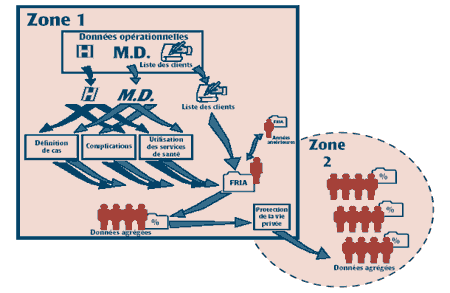 Dans le modèle, seules les données agrégées sont transférées de la Zone 1 à la Zone 2, confirmant ainsi le fait que les activités des organismes de la Zone 2 n'ont pas besoin de données individuelles sur la santé pour leurs activités. Les ensembles de données agrégées servent surtout à donner des renseignements stratifiés d'une manière adéquate, notamment des nombres, des taux, des sommes et d'autres statistiques sur la distribution selon des paramètres épidémiologiques (par exemple, les taux d'incidence et de prévalence se rattachant à l'affection à l'étude).