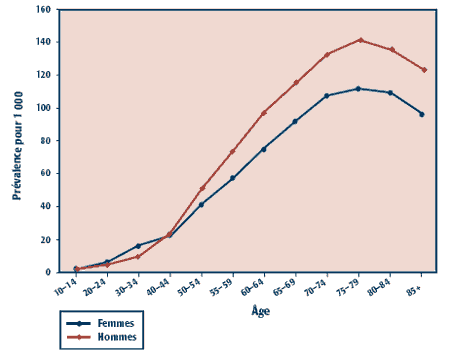 La figure 2 illustre les taux de prévalence estimés du diabète, selon le sexe, combinés pour les trois provinces. Le taux de prévalence augmente petit à petit chez les hommes et chez les femmes, jusqu'à la fourchette d'âge des 75 à 79 ans, après quoi, il affiche une faible baisse. Chez les femmes, ce taux est légèrement plus élevé dans le groupe des 20 à 40 ans, mais ce résultat est vraisemblablement attribuable à la façon dont le diabète gestationnel a été pris en compte dans le cadre du projet pilote. Par la suite, les taux de prévalence sont plus élevés chez les hommes que chez les femmes.