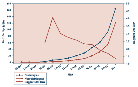 La figure 3 présente les taux de mortalité annuels chez les populations diabétique et non diabétique dans les provinces des Prairies et révèle une hausse au fur et à mesure que les deux populations avancent en âge. Chez les diabétiques, le taux de mortalité est systématiquement supérieur à celui des non-diabétiques. Le rapport des taux peut se calculer en divisant les taux de mortalité selon l'âge et le sexe dans la population diabétique par les mêmes taux dans la population non diabétique. Avant l'âge de 70 ans, le rapport des taux diminue pour passer d'environ cinq dans le groupe d'âge des 40 ans à environ deux dans les groupes d'âge de 70 ans et plus. Le fait de pouvoir faire état des taux de mortalité dans les populations diabétique et non diabétique et d'estimer les rapports comparatifs des taux montre à quel point il est important d'inclure l'ensemble de la population dans le FRIA et dans les ensembles de données agrégées.