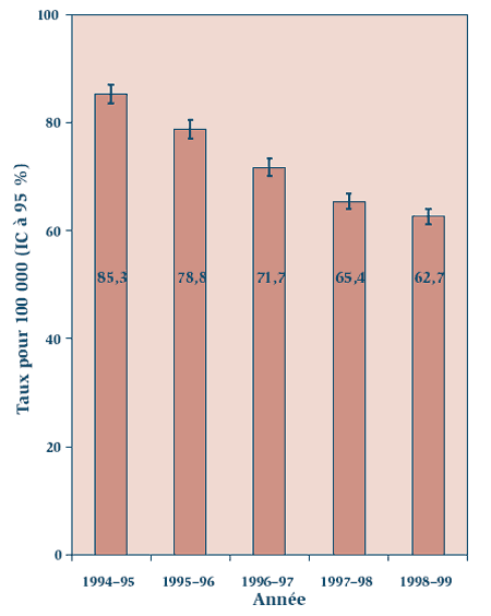 Taux d'hospitalisation pour traumatisme crânien standardisés pour l'âge en Ontario, de 1994-1995 à 1998-1999 (données tirées du Fichier minimal du Registre ontarien des traumatismes)
