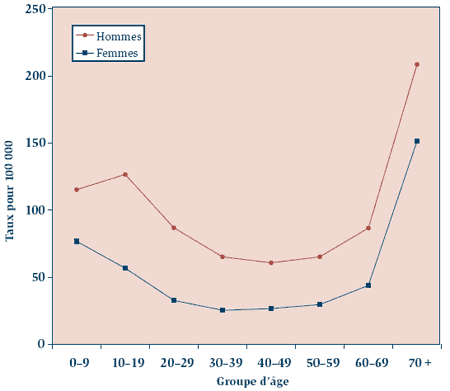 Au cours des années visées par l'étude, environ 12 % des patients dans le Fichier minimal et 70 % des patients dans le Fichier étendu ont souffert au moins d'un traumatisme crânien. Les taux annuels d'hospitalisation standardisés pour l'âge attribuables aux traumatismes crâniens ont diminué avec le temps, passant de 85,3 pour 100 000 en 1994-1995 (IC à 95 % : 83,6-87,0) à 62,7 pour 100 000 en 1998-1999 (IC à 95 % : 61,2-64,1; figure 1). Les taux de traumatismes étaient plus élevés chez les hommes que chez les femmes dans chaque groupe d'âge (figure 2). Les taux de traumatismes crâniens étaient supérieurs chez les deux sexes dans le groupe plus âgé (70 ans et plus) bien qu'on ait enregistré un pic modeste chez les hommes entre 10 et 19 ans.