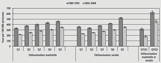 On observe une augmentation des taux de décès prématurés tant au début des années 1990 qu’au milieu des années 2000 en fonction de la défavorisation matérielle et sociale. Par ailleurs, le ratio de mortalité prématurée entre groupes extrêmes de défavorisation est passé de 1,8 en 1989-1993 à 2,4 en 2004-2008.