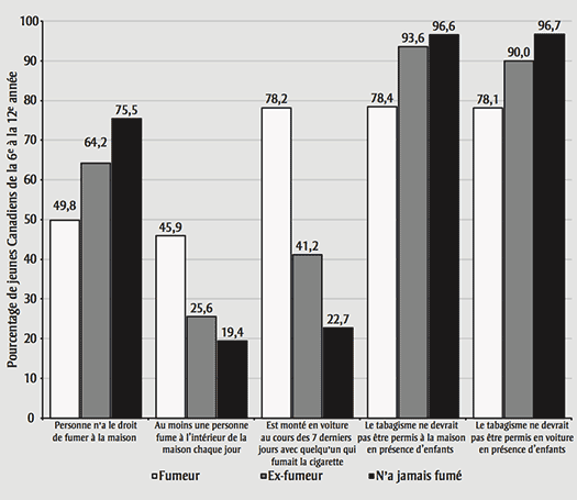 Malgré les données probantes démontrant les dangers de l'exposition à la FS dans les véhiculesNote de bas de page 9, Leatherdale et AhmedNote de bas de page 10 ont établi, à l'aide des données de l'Enquête sur le tabagisme chez les jeunes (ETJ) de 2004, que 26,3 % des jeunes Canadiens avaient été exposés à la FS à bord d'un véhicule au moins une fois au cours de la semaine précédent l'enquête. De même, 23,1 % des jeunes Canadiens avaient été exposés à la FS chez eux, et ce , malgré le fait que la grande majorité des jeunes aient déclaré que fumer devrait être interdit dans les véhicules et les maisons où il y a des enfantsNote de bas de page 10. Cette disparité montre que les jeunes sont sans doute incapables d'éviter dans certains contextes d'être exposés à la FS ou de limiter cette exposition.