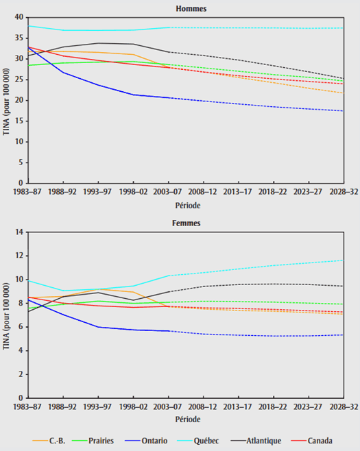 Si l'on tient compte du nombre prévu de cas in situ en Ontario, le nombre de cas pour l'ensemble du Canada augmenterait entre 2003-2007 et 2028-2032, passant approximativement de 5 510 à 10 135 cas annuellement chez les hommes, et de 2 005 à 3 560 cas chez les femmes. Le nombre annuel de nouveaux cas prévus en Ontario ajusté pour tenir compte des cas in situ connaîtrait une hausse, passant d'environ 2 045 à 3 825 cas chez les hommes et de 785 à 1 385 cas chez les femmes. La prédiction correspondante concernant les TINA ajustés en fonction des données de l'Ontario sera une baisse, soit de 31,1 à 26,4 pour 100 000 chez les hommes et de 9,4 à 8,8 pour 100 000 chez les femmes.