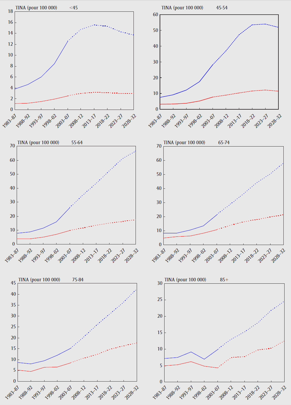 Tout au long de la période d'observation, les TINA de cancer de la thyroïde étaient plus élevés chez les femmes que chez les hommes dans tous les groupes d'âge. Le rapport hommes/femmes était le plus élevé dans le groupe le plus jeune (< 45 ans), diminuait de façon constante avec l'âge jusqu'à 74 ans pour ensuite augmenter légèrement dans les groupes plus âgés. Par ailleurs, le rapport femmes/hommes augmentait avec les années dans chacun des groupes d'âge, les hausses les plus marquées étaient enregistrées chez les moins de 55 ans. La tendance à la hausse observée au chapitre des TINA du cancer de la thyroïde s'est poursuivie dans les périodes de prédiction pour les deux sexes, dans chacun des groupes d'âge. Toutefois, on prévoit que les taux pour les deux sexes atteindront leur point culminant après 10 ans dans le groupe le plus jeune et après 20 ans dans le groupe des 45 à 54 ans.