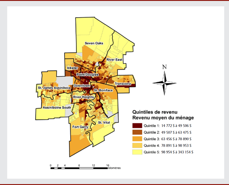 Nous avons en deuxième lieu utilisé les données du recensement canadien de 2011 à l'échelle de l’aire de diffusion pour répartir les 5 500 îlots de diffusion de la Région sanitaire de Winnipeg en quintiles, selon le revenu moyen du ménage et selon les seuils de revenu établis par le Centre manitobain des politiques en matière de santéNote de bas de page 29. Chaque quintile de revenu renferme environ 20 % de la population de Winnipeg (tableau 2). Dans le cadre de notre étude, le revenu moyen du ménage a servi d’indicateur du pouvoir d’achat de la population concernant les aliments et a également été utilisé comme indicateur substitutif de la possibilité de posséder une voiture. On a attribué aux îlots de diffusion la classification en quintiles de revenu de l’aire de diffusion dont ils faisaient partie. L’aire de diffusion est la plus petite unité géographique pour laquelle Statistique Canada diffuse des données de recensement détaillées, et il en existe 1 150 dans la Région sanitaire de Winnipeg. Un îlot de diffusion est plus petit qu’une aire de diffusion (il y a environ cinq îlots de diffusion par aire de diffusion), mais aucune donnée de recensement détaillée n’est disponible à cette échelle.
