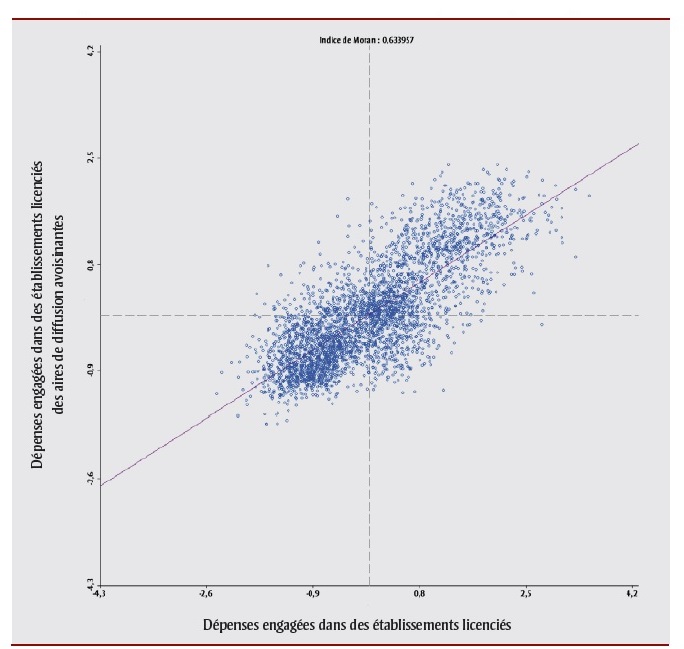Méthodologie. D'après l'Enquête sur les dépenses des ménages de 2010, ce sont les dépenses totales moyennes des ménages à l'échelle des AD en boissons alcoolisées achetées dans des établissements licenciés qui sont la variable ayant la plus grande incidence sur les résultats. L'indice de Moran et l'indice local de Moran ont été utilisés pour quantifier les variations spatiales et pour identifier les points chauds et les points froids en termes de dépenses. Nous avons utilisé, dans divers modèles multidimensionnels de régression spatiale, les caractéristiques socioéconomiques à l'échelle des AD tirées du Recensement de 2006 ainsi que des ensembles de données de 2008 de DMTI Spatial et de 2010 de CanMap concernant la densité des établissements licenciés et les autres caractéristiques socioéconomiques de l'environnement bâti afin de prédire les dépenses en alcool.