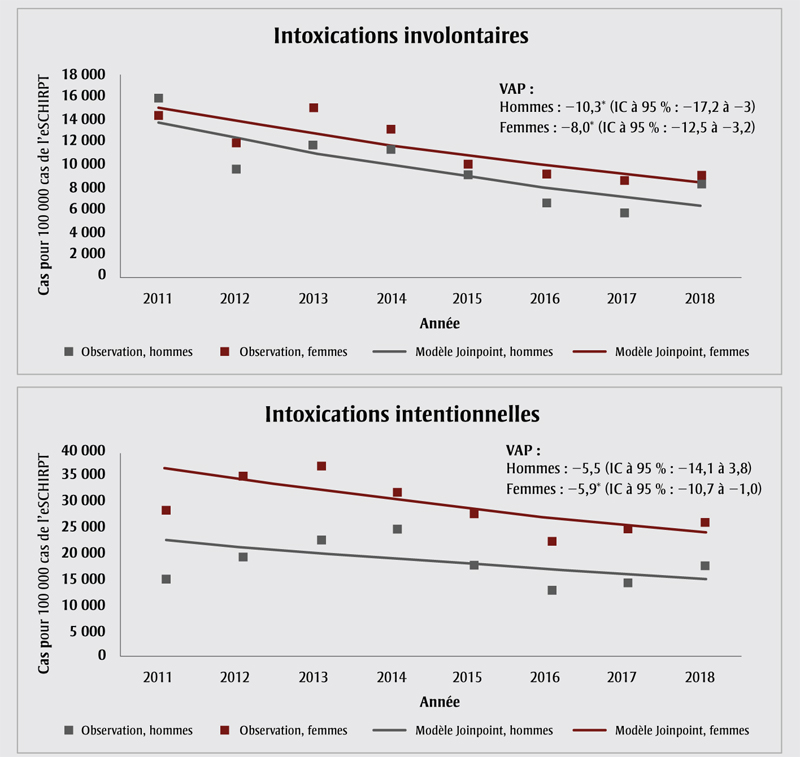 La figure 1 montre les résultats de l’analyse au moyen du logiciel Joinpoint par modalité d’intention et par sexe pour 2011-2018 (les données pour 2019 sont incomplètes et, par conséquent, exclues de l’analyse des tendances). Nous n’avons trouvé aucun point d’inflexion et nous avons représenté les tendances globales par la VAP. Au sein des intoxications involontaires, nous avons observé une tendance décroissante significative de la proportion d’intoxications liées à l’acétaminophène aussi bien chez les hommes (−10,3 %; intervalle de confiance [IC] à 95 % : de −17,2 à −3,0) que chez les femmes (−8,0 %; IC à 95 % : de −12,5 à −3,2). Pour les intoxications intentionnelles à l’acétaminophène, une diminution significative a eu lieu chez les femmes (−5,9 %; IC à 95 % : de −10,7 à −1,0), mais pas chez les hommes.