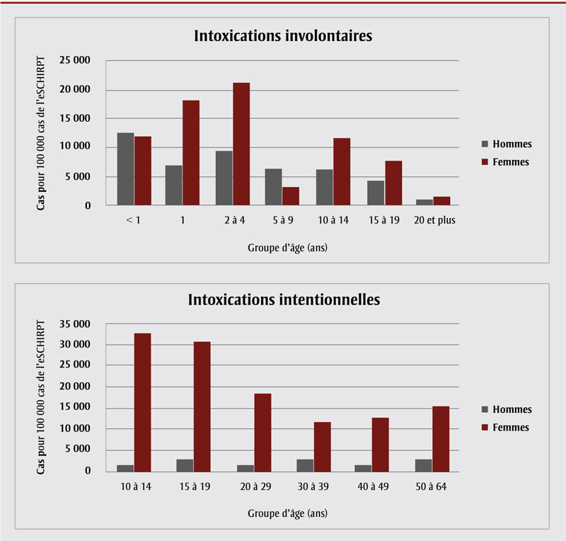 Remarque : En raison de l’instabilité des données, les groupes d’âge des moins de 10 ans et des plus de 65 ans n’ont pas été inclus dans l’analyse sur l’intoxication intentionnelle.