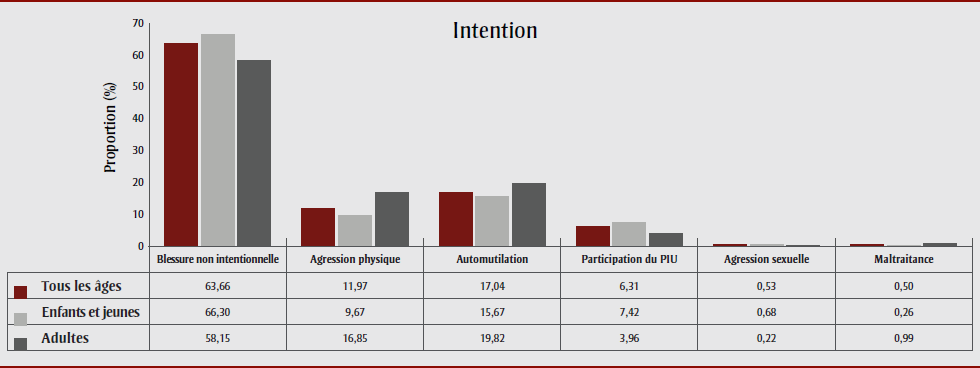 | Intention de la blessure ou de l’intoxication | Blessure non intentionnelle | 10IN, 16IN | Pour examiner la nature intentionnelle de la blessure ou de l’intoxication. Des termes de recherche par mots-clés ont également été utilisés pour la classification. |