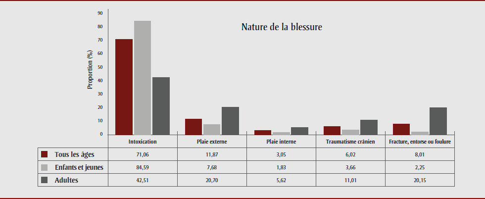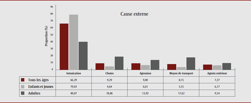 - Dans tous les groupes, l’intoxication s’est révélée la principale cause externe de blessure.