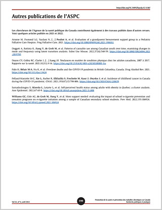 Les chercheurs de l’Agence de la santé publique du Canada contribuent également à des travaux publiés dans d’autres revues. Voici quelques articles publiés en 2021 et 2022.