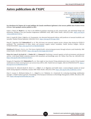 Les chercheurs de l’Agence de la santé publique du Canada contribuent également à des travaux publiés dans d’autres revues et livres. Voici quelques articles publiés en 2023.