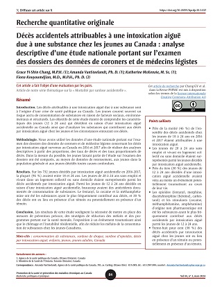 Chang GY, VanSteelandt A, McKenzie K, Kouyoumdjian F. Décès accidentels attribuables à une intoxication aiguë due à une substance chez les jeunes au Canada : analyse descriptive d’une étude nationale portant sur l’examen des dossiers des données de coroners et de médecins légistes. Promotion de la santé et prévention des maladies chroniques au Canada. 2024;44(3):84-96. https://doi.org/10.24095/hpcdp.44.3.02f