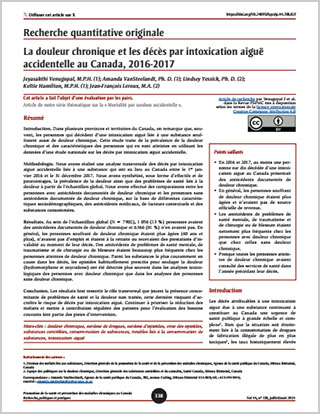 Venugopal J, VanSteelandt A, Yessick L, Hamilton K, Leroux JF. La douleur chronique et les décès par intoxication aiguë accidentelle au Canada, 2016-2017. Promotion de la santé et prévention des maladies chroniques au Canada. 2024;44(7/8):338-352. https://doi.org/10.24095/hpcdp.44.7/8.02f