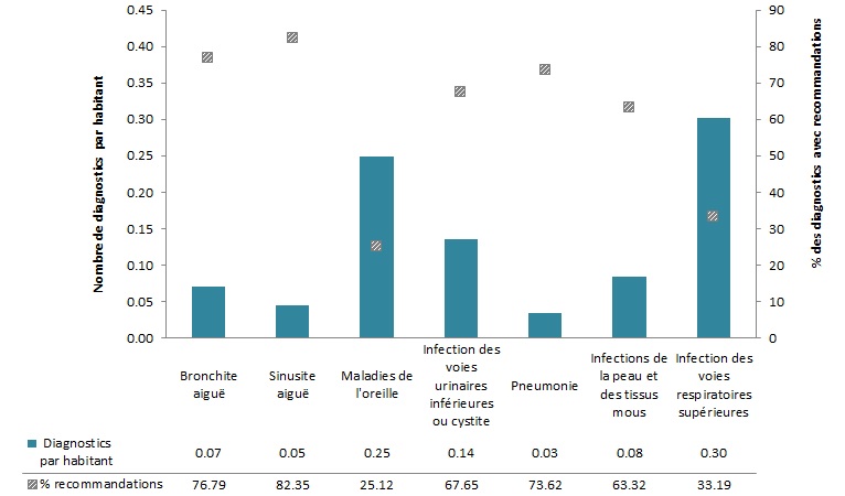 Figure 2 : Nombre de diagnostics précis par personne et pourcentage de ces diagnostics accompagnés de recommandations liées à un antimicrobien au Canada, en 2014