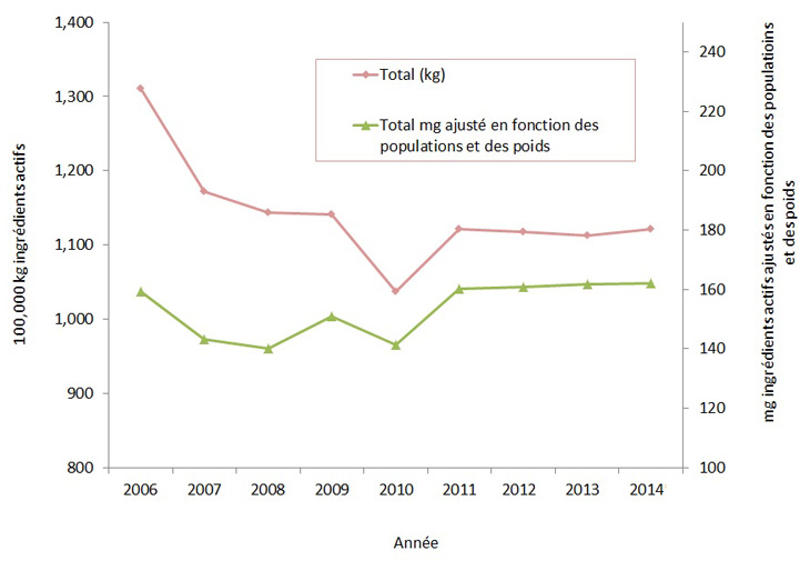 Figure 3 : Antimicrobiens importants sur le plan médical distribués pour utilisation chez les animaux au fil du temps, mesurés en kilogrammes et en milligrammes d'ingrédients actifs, rajustés en fonction des populations et des poids, de 2006 à 2014