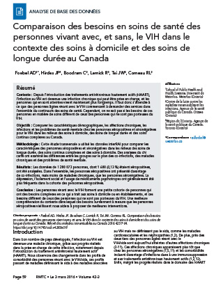 Foebel AD, Hirdes JP, Boodram C, Lemick R, Tai JW, Comeau RL. Comparaison des besoins en soins de santé des personnes vivant avec, et sans, le VIH dans le contexte des soins à domicile et des soins de longue durée au Canada. Relevé des maladies transmissibles au Canada 2016;42:59-64. https://doi.org/10.14745/ccdr.v42i03a01f
