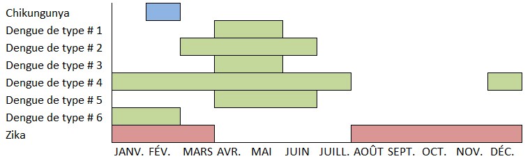 Du mois d’août au mois de novembre, aucun cas de la dengue ou du virus du chikungunya n’a été signalé. Cependant, le virus Zika a été signalé à une reprise au cours de chacun de ces mois.