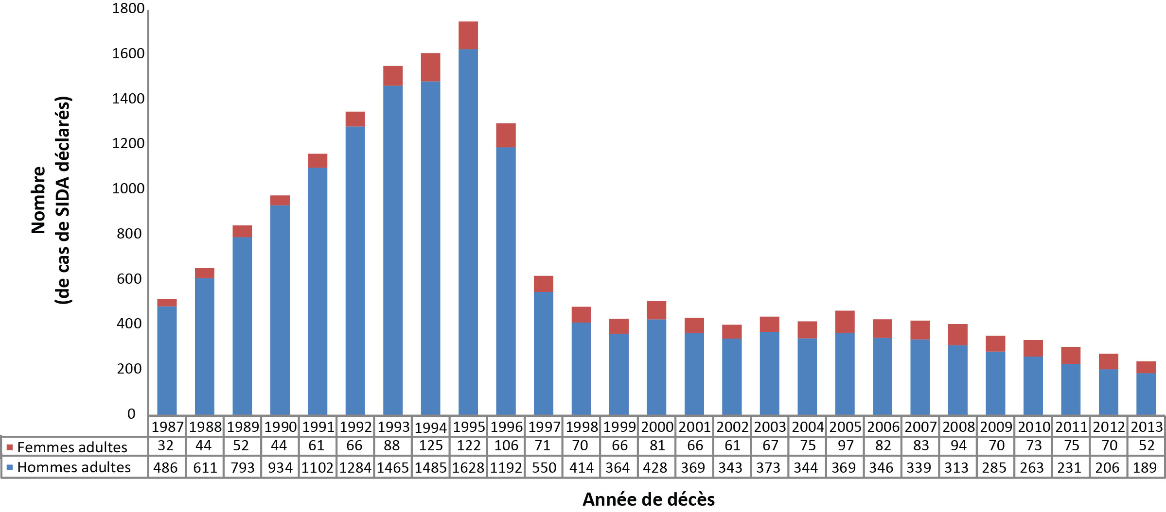 | Année de décès | Hommes adultes | Femmes adultes | Total |