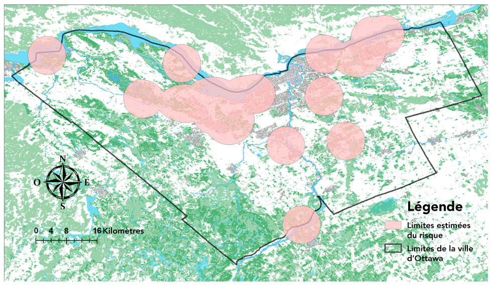 Cette carte présente les zones à risque, basées sur un rayon de 5 km autour des sites où la présence de tiques a été détectée. Celles-ci étaient largement réparties autour d’Ottawa, avec une couverture plus importante dans les zones boisées de la partie ouest de la région et le long de la rivière des Outaouais.