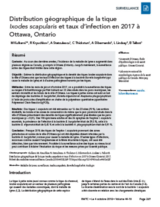 Kulkarni M, Kryuchkov R, Statculescu A, Thickstun C, Dibernardo A, Lindsay L, Talbot B. Distribution géographique de la tique Ixodes scapularis et taux d’infection en 2017 à Ottawa (Ontario), 2017. Relevé des maladies transmissibles au Canada 2018;44(10):269-75. https://doi.org/10.14745/ccdr.v44i10a02f