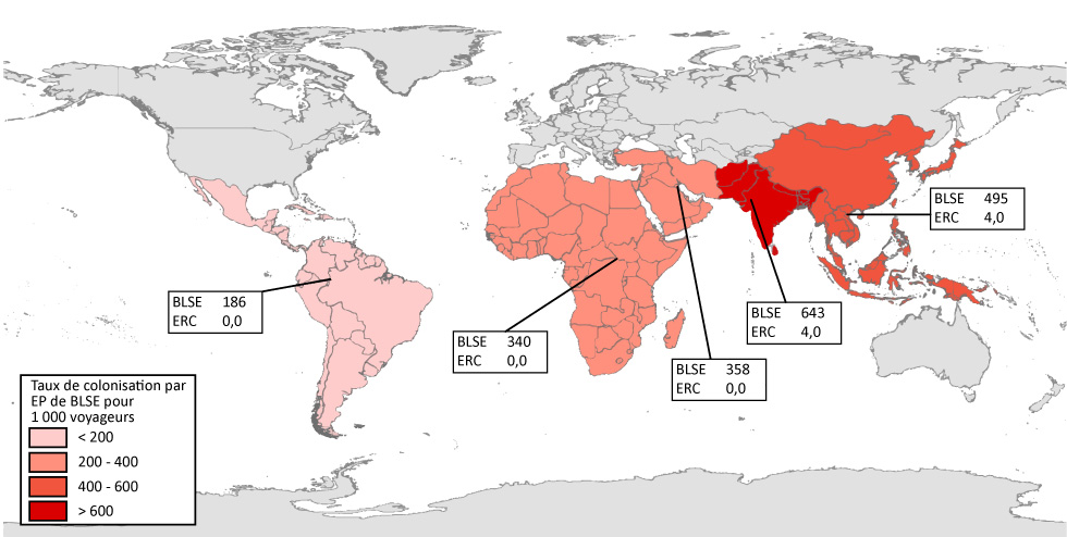 Figure 1 : Nombre d’entérobactéries productrices de bêta-lactamases à spectre étendu (BLSE) et d’entérobactéries résistantes aux carbapénèmes (ERC) pour 1 000 voyageurs, selon la région visitée