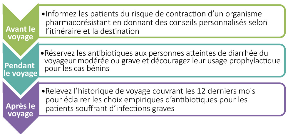 En comprenant le risque de résistance aux antimicrobiens associé aux voyages, les professionnels de la santé seront plus en mesure d’intégrer des méthodes visant à améliorer la prise en charge et à réduire la transmission d’organismes pharmacorésistants, ainsi que d’informer le public pour qu’il puisse prendre des décisions éclairées (Figure 2). Parmi les occasions qui se présentent aux cliniciens, citons les suivantes :