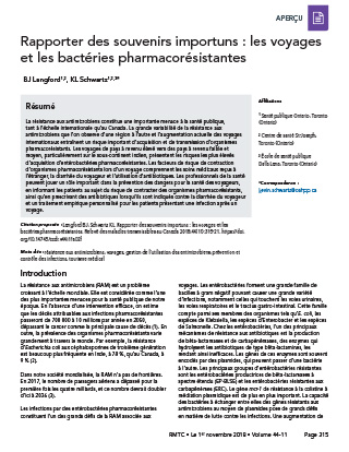 Langford BJ, Schwartz KL. Rapporter des souvenirs importuns : les voyages et les bactéries pharmacorésistantes. Relevé des maladies transmissibles au Canada 2018;44(11):315-21. https://doi.org/10.14745/ccdr.v44i11a02f