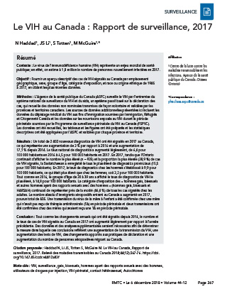 Haddad N, Li JS, Totten S, McGuire M. Le VIH au Canada : Rapport de surveillance, 2017. Relevé des maladies transmissibles au Canada 2018;44(12):367-76. https://doi.org/10.14745/ccdr.v44i12a03f
