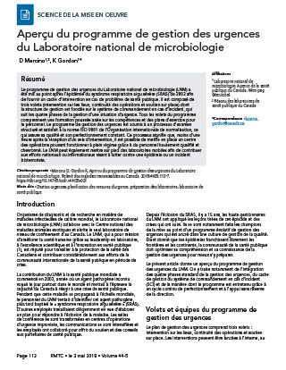 Marcino D, Gordon K. Aperçu du programme de gestion des urgences du Laboratoire national de microbiologie. Relevé des maladies transmissibles au Canada. 2018;44(5):113-7. https://doi.org/10.14745/ccdr.v44i05a02f