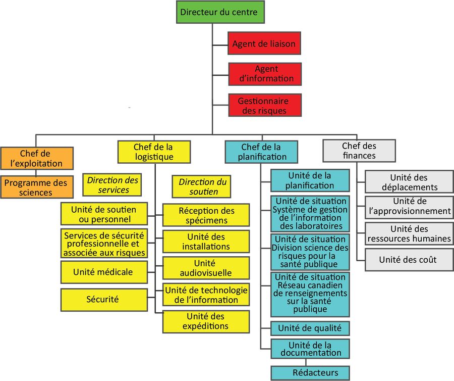 La structure organisationnelle du SCI du centre des opérations est très robuste (figure 1). L'un des aspects importants de cette structure est qu'elle peut être adaptée à chaque situation. Par exemple, pendant des crises majeures – la pandémie de H1N1 en 2009 – tout le personnel a pu être mobilisé 24 heures sur 24, sept jours sur sept. Inversement, pendant des crises plus circonscrites (comme les mobilisations récentes de l'équipe de diagnostic des pathogènes spéciaux en Sierra Leone pour le projet de biobanque de virus Ebola), le personnel du centre des opérations a été réduit pour ne comprendre que les postes essentiels, comme le directeur, l'agent de liaison et le chef de la logistique.
