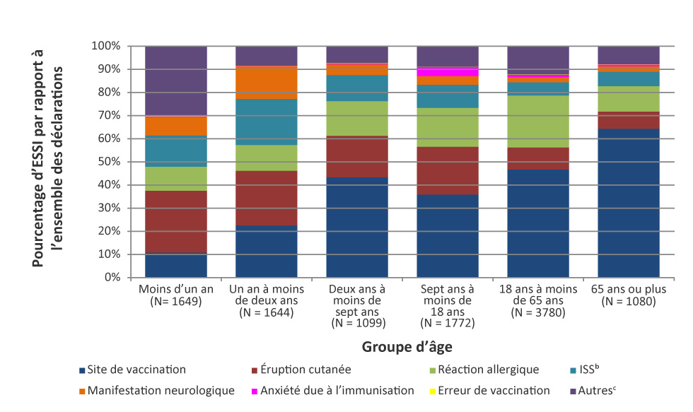 Résultats : Au cours de la période de quatre ans, 11 079 déclarations d’ESSI ont été reçues, de partout au Canada. Le taux moyen annuel de déclarations d’ESSI était de 13,4 pour 100 000 doses distribuées au Canada des vaccins administrés de 2013 à 2016; ce taux était inversement proportionnel à l’âge. La majorité des déclarations (92 %) portait sur des effets non graves, soit des éruptions cutanées au point d’injection et des réactions allergiques. Dans l’ensemble, il y a eu 892 déclarations d’ESG, soit un taux de déclarations de 1,1 pour 100 000 doses distribuées de 2013 à 2016. Parmi les déclarations d’ESG, les principaux ESSI les plus courants étaient l’anaphylaxie suivie des convulsions. Les vaccins conjugués contre le méningocoque du groupe C (administrés de façon concomitante) étaient associés au taux d’ESSI le plus élevé, soit 91,6 pour 100 000 doses distribuées. On n’a observé aucun problème inattendu d’innocuité des vaccins ni aucune augmentation de la fréquence ou de la gravité des effets secondaires attendus.