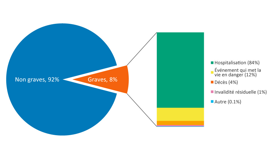 La figure 5 illustre un diagramme circulaire dont une petite section a été retirée à la droite pour décrire les événements secondaires. La portion bleue qui est plus volumineuse représente 92 pourcent du diagramme et correspond aux déclarations d’effets secondaires non-graves. La petite section orange représente 8 pourcent du diagramme et correspond aux déclarations d’effets secondaires graves. Cette section orange est liée à un graphique linéaire qui illustre la proportion des différents types d’effets secondaires graves qui ont été déclarés. L’hospitalisation représente 84 pourcent des effets secondaires graves et est présentée en vert. Les événements mettant la vie en danger représentent 12 pourcent des effets secondaires graves et est présentée en jaune. Les décès représentent 4 pourcent des effets secondaires graves et sont présentés en orange pâle. Les invalidités résiduelles représentent 1 pourcent des effets secondaires graves et sont présentées en rose. Finalement les autres effets représentent 0,1 pourcent des effets secondaires graves et sont présentés en bleu.