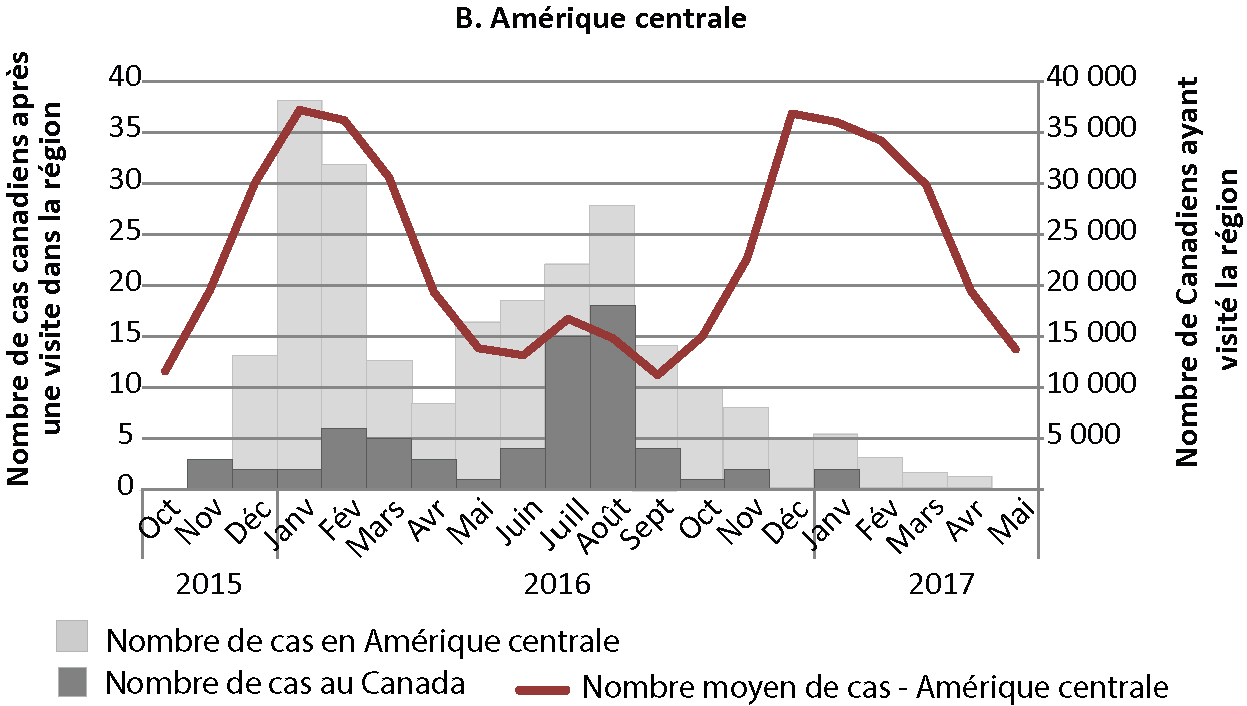 Dans le graphique B, Amérique centrale, les 68 (100 %) Canadiens infectés avaient visité la région entre novembre 2015 et janvier 2017. De un à six cas étaient déclarés par mois entre novembre 2015 et juin 2016. On a observé une augmentation en juillet et en août, mois où 15 et 18 cas ont été déclarés respectivement. À la suite, le nombre de cas signalés a diminué pour atteindre 0 à 4 par mois jusqu’en janvier 2017. Aucun autre cas n’a été déclaré après cette date. Les cas canadiens coïncidaient avec l’épidémie en Amérique centrale. La courbe épidémique illustrant l’éclosion en Amérique centrale montre deux pointes : la première s’est produite en janvier et en février 2016 et la seconde, de mai à septembre 2016. Les habitudes de voyage des Canadiens vers l’Amérique centrale varient selon les saisons, les grandes périodes de pointe étant de décembre à mars. La pointe observée dans le nombre de Canadiens infectés qui avaient visité l’Amérique centrale (juillet et août) coïncidait avec la morte-saison.