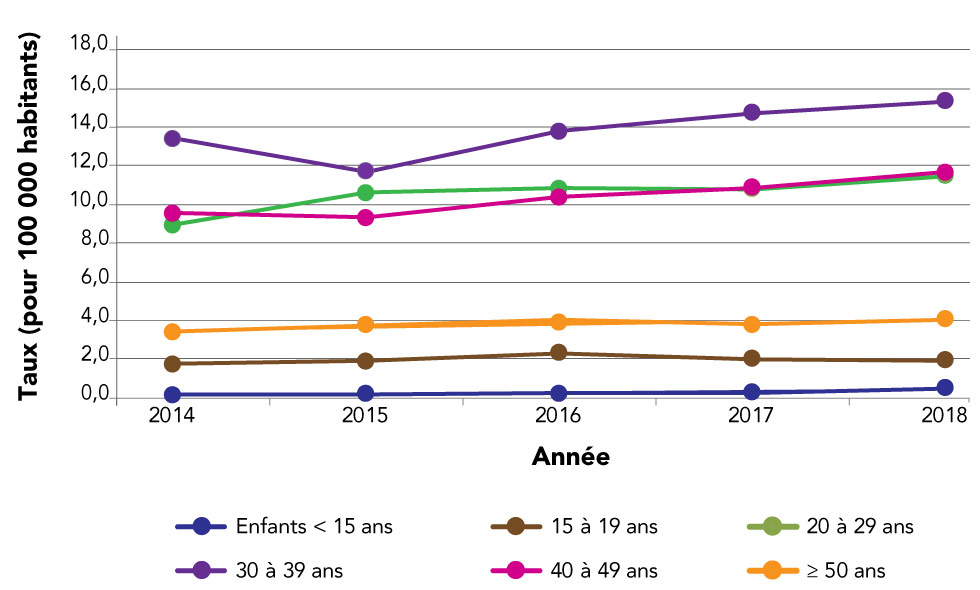 Par conséquent, le groupe des 30 à 39 ans présentait le taux le plus élevé de cas de VIH déclarés, soit 15,4 pour 100 000 habitants (figure 3). Le groupe des 40 à 49 ans vient au deuxième rang avec 11,7 pour 100 000 habitants, suivi du groupe des 20 à 29 ans avec 11,5 pour 100 000 habitants. Le groupe des 20 à 29 ans et celui des 40 à 49 ans ont des taux similaires depuis 2016. Dans l'ensemble, les taux de diagnostic chez les enfants (moins de 15 ans), les 15 à 19 ans et les 50 ans et plus sont demeurés relativement stables au cours des cinq dernières années.