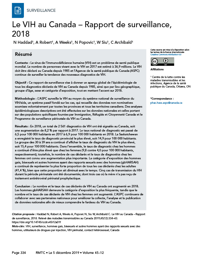 Haddad N, Robert A, Weeks A, Popovic N, Siu W, Archibald C. Le VIH au Canada — Rapport de surveillance, 2018. Relevé des maladies transmissibles au Canada 2019;45(12):334–43. https://doi.org/10.14745/ccdr.v45i12a01f