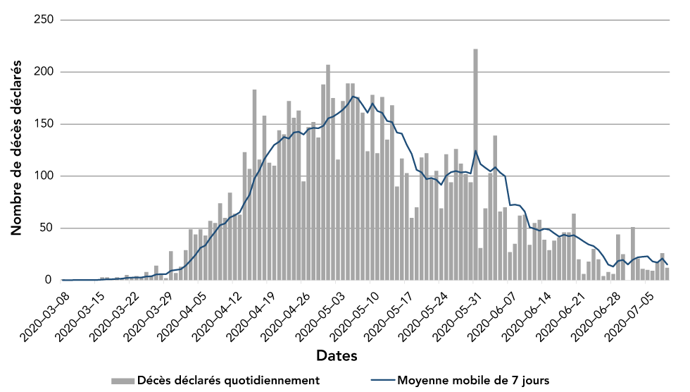En date du 9 juillet 2020, 106 804 cas de COVID-19 ont été déclarés au Canada, et le nombre de décès déclarés parmi ces cas était de 8 749. Le nombre de décès déclarés quotidiennement a augmenté régulièrement depuis la fin mars pour atteindre un pic au début mai; en moyenne, 177 décès ont été déclarés quotidiennement entre le 30 avril et le 6 mai. Le nombre quotidien de décès déclarés a ensuite diminué régulièrement et, dans la semaine précédant le 9 juillet 2020, une moyenne de 15 décès a été déclarée chaque jour (figure 1). Cela correspond à la tendance du nombre de cas déclarés quotidiennement qui a été observée deux à trois semaines plus tôt. Cette situation était attendue, puisque les décès liés à la COVID-19 représentent des infections survenues plusieurs semaines auparavantNote de bas de page 2Note de bas de page 3Note de bas de page 4.