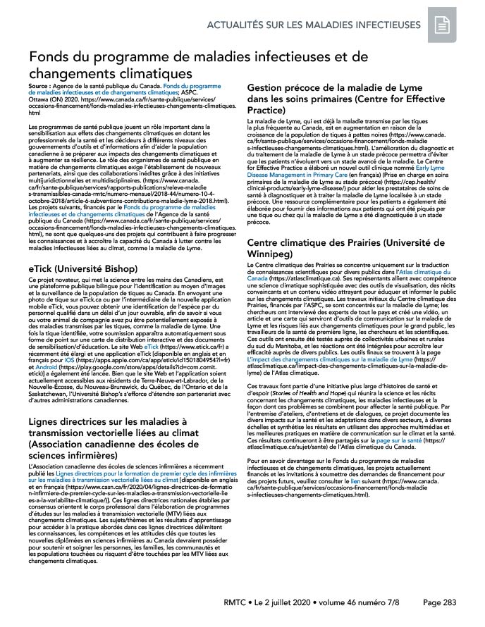 La maladie de Lyme, qui est déjà la maladie transmise par les tiques la plus fréquente au Canada, est en augmentation en raison de la croissance de la population de tiques à pattes noires. L’amélioration du diagnostic et du traitement de la maladie de Lyme à un stade précoce permettra d’éviter que les patients n’évoluent vers un stade avancé de la maladie. Le Centre for Effective Practice a élaboré un nouvel outil clinique nommé Early Lyme Disease Management in Primary Care (en français) (Prise en charge en soins primaires de la maladie de Lyme au stade précoce) pour aider les prestataires de soins de santé à diagnostiquer et à traiter la maladie de Lyme localisée à un stade précoce. Une ressource complémentaire pour les patients a également été élaborée pour fournir des informations aux patients qui ont été piqués par une tique ou chez qui la maladie de Lyme a été diagnostiquée à un stade précoce.