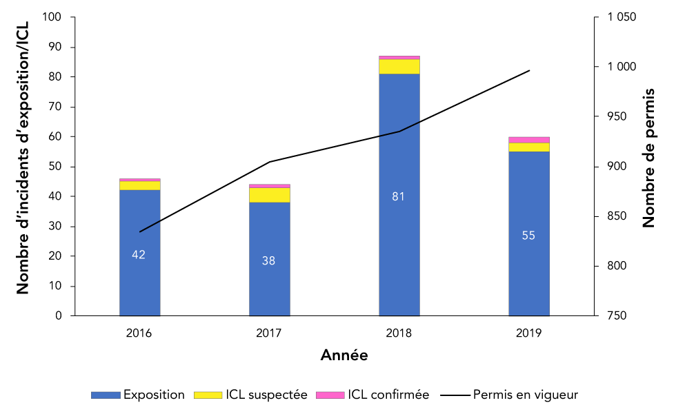 | Année | Total | Exposition seulement | ICL soupçonnées | ICL confirmées | Permis en vigueur |