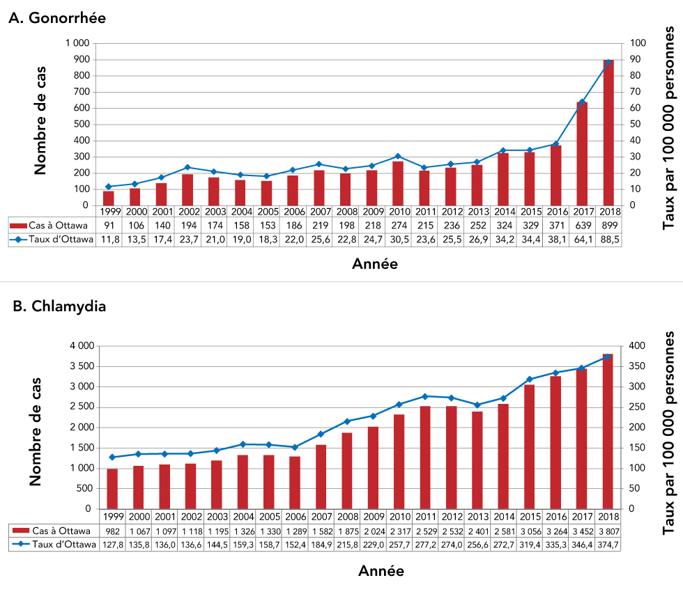 Neisseria gonorrhoea (N. gonorrhoea) et Chlamydia trachomatis (C. trachomatis) sont les infections transmissibles sexuellement (ITS) les plus couramment signalées au Canada et leur incidence augmenteNote de bas de page 1. À Ottawa, en Ontario, les taux d’incidence observés de gonorrhée et de chlamydia ont également augmenté au cours des 20 dernières années. Toutefois, le taux d’augmentation pour la gonorrhée est considérablement plus élevé depuis 2016 (figure 1)Note de bas de page 2. Au total, 90 cas et 390 cas de gonorrhée et de chlamydia, respectivement, ont été diagnostiqués pour 100 000 habitants en 2018 à Ottawa; en hausse par rapport à 38 cas et 335 cas pour 100 000 habitants en 2016Note de bas de page 2. Les taux de ces infections à Ottawa ont augmenté de façon particulièrement marquée chez les hommes ayant des relations sexuelles avec d’autres hommes (HARSAH). En 2018, les HARSAH représentaient 45 % des cas de gonorrhée et 10 % des cas de chlamydiaNote de bas de page 2.