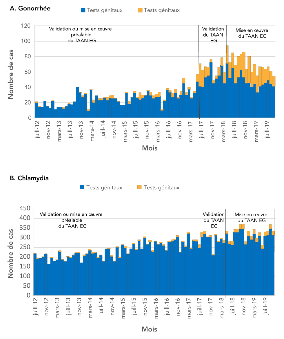 En Ontario, le TAAN extragénital a été validé dans les cliniques d’ITS d’Ottawa et de Toronto chez les HARSAH, les travailleurs du sexe et leurs clients, et les contacts connus des personnes ayant reçu un diagnostic de gonorrhée ou de chlamydiaNote de bas de page 7. Cette validation a fait intervenir des cliniciens qui effectuent des cultures extragénitales et le TAAN pour les clients susmentionnés lorsqu’ils donnent leur consentement. Tous ces échantillons ont été envoyés au Laboratoire de santé publique de l’Ontario aux fins d’analyse et de comparaison. Comparativement à la culture, le TAAN présentait une sensibilité de 92,2 % et une spécificité de 99,9 % pour les tests pharyngiens et une sensibilité de 99,4 % et une spécificité de 99,9 % pour les tests rectaux. Le TAAN pour la gonorrhée, comparativement à la culture, a obtenu des résultats semblables; déterminer une sensibilité de 100 % pour les tests pharyngés et rectaux et une spécificité de 98,2 % et de 99,0 % pour la spécificité pharyngienne et rectale, respectivementNote de bas de page 7. Par site, la culture, comparativement au TAAN, avait un taux de détection de 13 % pour la gonorrhée pharyngienne, de 67 % pour la gonorrhée rectale, de 17 % pour la chlamydia pharyngienne et de 38 % pour la chlamydia rectale. Cette validation du TAAN extragénital a eu lieu de juillet à novembre 2017, suivie d’une mise en œuvre complète en avril 2018. Malgré ce changement dans la méthodologie des analyses, il n’y a eu aucun changement dans la pratique clinique pendant cette période. Les lignes directrices nationales recommandaient des tests extragénitaux et, dans la clinique de santé sexuelle, ces tests étaient régulièrement effectués (en utilisant la culture) lorsqu’ils étaient cliniquement indiqués et acceptés par les clients. Des tests extragénitaux ont été effectués par des médecins qui ont suivi les pratiques cliniques établies pour la collecte d’échantillons à ces sites. Les échantillons ont ensuite été envoyés au Laboratoire de santé publique de l’Ontario. Au cours de la période d’étude, la collecte d’échantillons extragénitaux par le patient n’était pas disponible.