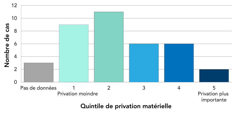 Ce graphique affiche les indices de difficulté matérielle par quintiles qui ont été déterminés pour chaque cas afin de construire un profil global de la difficulté matérielle en tant qu’indicateur du statut socio-économique. Le score de difficulté matérielle mesure l’incapacité des personnes à accéder aux besoins matériels de base tels que le niveau d’éducation ou un logement de qualité. Des scores quintiles plus élevés indiquent un niveau de difficulté plus important et sont associés à des zones de statut socio-économique inférieur. Cinquante-quatre % des cas se situaient dans les quintiles inférieurs ou moyens de difficulté matérielle, tandis que 38 % des cas se situaient dans les quintiles supérieurs de difficulté matérielle. Aucune donnée n’était disponible pour les 8 % de cas restants.
