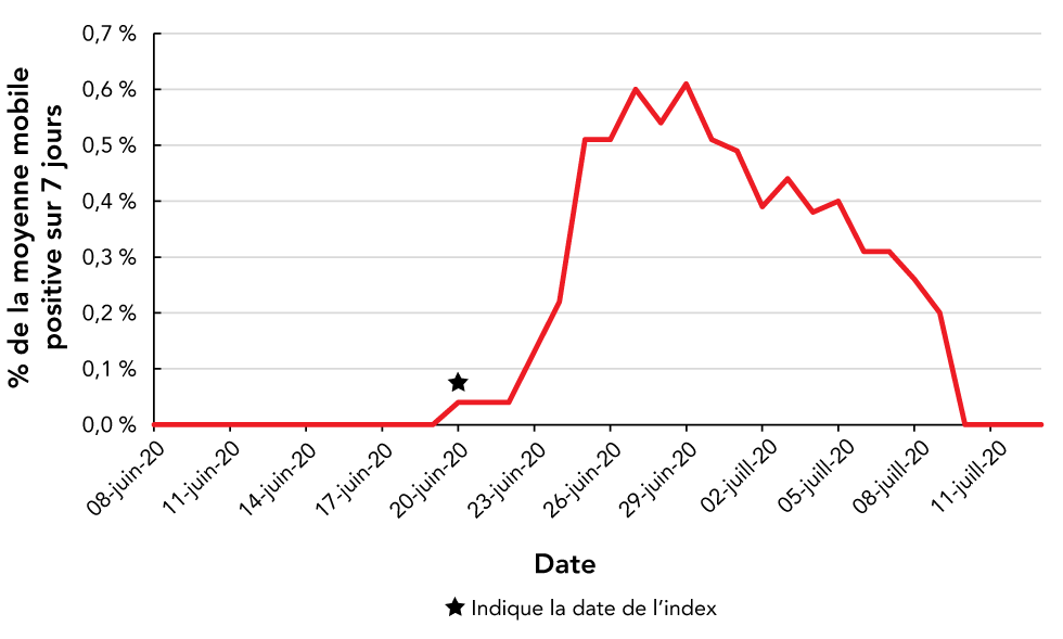 Le service de Santé publique de la région de Kingston, Frontenac, Lennox et Addington avait une approche multimodale d’écouvillonnage, comprenant des centres d’évaluation fixes, une capacité de dépistage au volant et des tests de dépistage ciblés sur le site l’établissement. Les taux de dépistage entre le 20 juin et le 5 juillet ont été élevés en réaction à l’attention médiatique et aux messages du service de Santé publique de la région de Kingston, Frontenac, Lennox et Addington. Le nombre de tests de dépistage effectués pendant l’éclosion a été multiplié par approximativement quatre par rapport aux semaines de référence précédentes (figure 6). En outre, le nombre cumulé de tests de dépistage effectués dans la région de Kingston, Frontenac, Lennox et Addington depuis le début de cette éclosion a dépassé les 10 000 tests le 7 juillet. Le pourcentage de positivité est resté faible et a atteint un sommet de 0,61 % le 29 juin (figure 7).