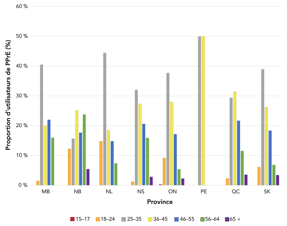 Dans cinq des provinces (Terre-Neuve-et-Labrador, Nouvelle-Écosse, Ontario, Île-du-Prince-Édouard et Saskatchewan), le groupe d’âge présentant la plus forte proportion d’utilisation de PPrE était celui des 25 à 35 ans, suivi de celui des 36 à 45 ans (figure 3). L’âge des utilisateurs de la PPrE diffère pour le Manitoba, les personnes âgées de 46 à 55 ans représentant la deuxième plus grande proportion d’utilisateurs. Au Nouveau-Brunswick, les utilisateurs de PPrE étaient plus âgés, la plus grande proportion d’utilisateurs de PPrE se trouvant chez les 36 à 45 ans, suivis des 56 à 64 ans. Au Québec, la plus grande proportion se trouvait chez les personnes âgées de 36 à 45 ans, suivies des 25 à35 ans.